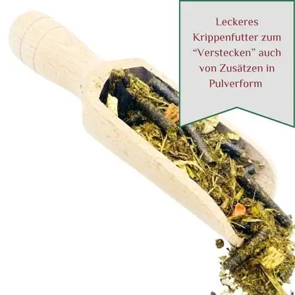 Oft wird Krippenfutter nur gefüttert, weil man ein Futter braucht, in dem man Mineralfutter oder anderes Pulver "verstecken" kann. Strukturhäcksel oder reines Pelletfutter ist dafür nicht geeignet, denn da rieselt Pulver durch oder wird einfach weggepustet.
